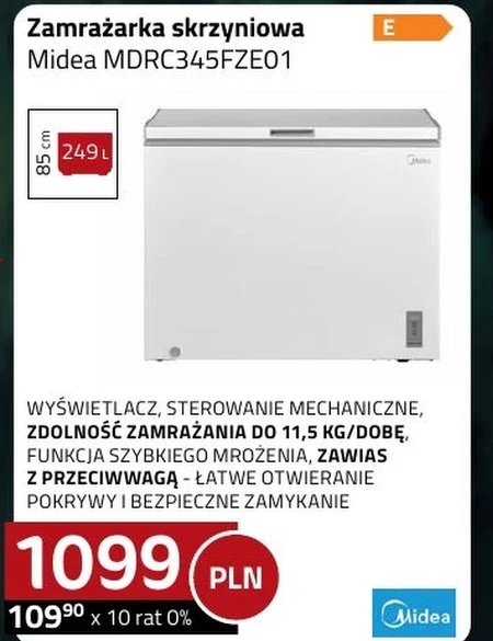 Zamrażarka skrzyniowa Midea MDRC345FZE01 85 cm 249 l WYŚWIETLACZ, STEROWANIE MECHANICZNE, ZDOLNOŚĆ ZAMRAŻANIA DO 11,5 KG/DOBĘ, FUNKCJA SZYBKIEGO MROŻENIA, ZAWIAS Z PRZECIWWAGĄ – ŁATWE OTWIERANIE POKRYWY I BEZPIECZNE ZAMYKANIE
