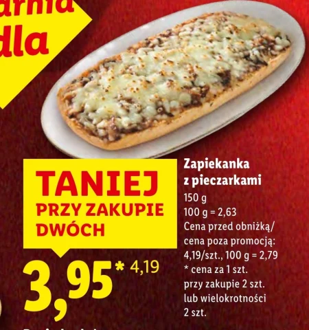 Zapiekanka z pieczarkami 150 g 100 g = 2,63 Cena przed obniżką/ cena poza promocją: 4,19/szt., 100 g = 2,79 * cena za 1 szt. przy zakupie 2 szt. lub wielokrotności 2 szt.