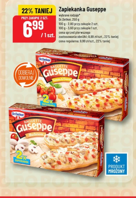 Zapiekanka Guseppe wybrane rodzaje* Dr.Oetker, 250 g 100 g - 2,80 przy zakupie 2 szt. 100 g - 3,60 przy zakupie 1 szt. cena sprzed pierwszego zastosowania obniżki: 8,99 zł/szt., 22% taniej cena regularna: 8,99 zł/szt., 22% taniej