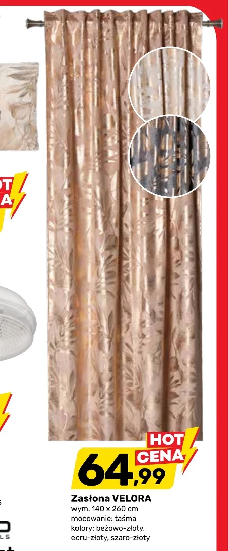 Zasłona VELORA w Bricomarche dostępna jest już za 64,99 zł, a jej wymiary 140 x 260 cm pozwolą na eleganckie wykończenie okna w Twoim domu. Wybierz spośród trzech stonowanych kolorów – beżowo-złotego, ecru-złotego lub szaro-złotego – dopasowując ją do swojego wnętrza. Montaż jest prosty dzięki zastosowaniu taśmy, a zasłona skutecznie reguluje dopływ światła i zapewnia prywatność.