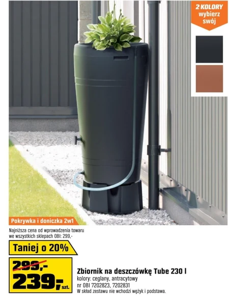 Zbiornik na deszczówkę Tube 230 I kolory: ceglany, antracytowy nr OBI 7202823, 7202831 W skład zestawu nie wchodzi wężyk i podstawa.