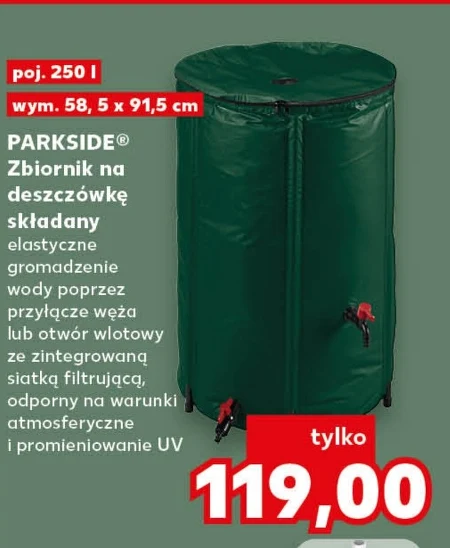 PARKSIDE® Zbiornik na deszczówkę w Kauflandzie dostępny jest teraz za 119,00 zł. Składany zbiornik o pojemności 250 litrów i wymiarach 58,5 x 91,5 cm pozwoli na ekologiczne gromadzenie wody deszczowej do podlewania ogrodu lub mycia samochodu. Wyposażony jest w elastyczne przyłącze węża oraz otwór wlotowy ze zintegrowaną siatką filtrującą, co zapewnia czystość gromadzonej wody. Produkt jest odporny na warunki atmosferyczne i promieniowanie UV, dzięki czemu posłuży przez długi czas – warto wykorzystać tę okazję i zadbać o oszczędność wody.