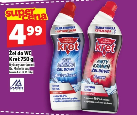 Żel do WC Kret 750 g Wybrany asortyment Dr. Miele Group Cena za 1 szt. (6,65 zł/kg) Skuteczny żel do WC Kret to niezastąpiony sprzymierzeniec w walce z uporczywymi zabrudzeniami i osadami w toalecie, zapewniając błyszczącą czystość i higienę w łazience. Formuła żelu Kret doskonale radzi sobie z kamieniem, rdzą i innymi trudnymi do usunięcia plamami, pozostawiając świeży zapach i długotrwały efekt. Użycie Kretu to gwarancja czystej toalety i komfortu użytkowania, a jego pojemność 750g pozwala na wielokrotne zastosowanie w każdym gospodarstwie domowym.