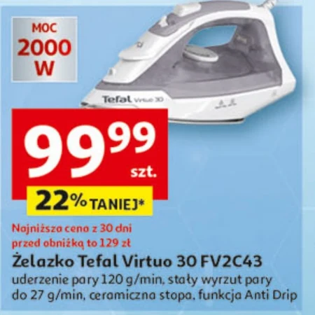Żelazko Tefal Virtuo 30 FV2C43 uderzenie pary 120 g/min, stały wyrzut pary do 27 g/min, ceramiczna stopa, funkcja Anti Drip