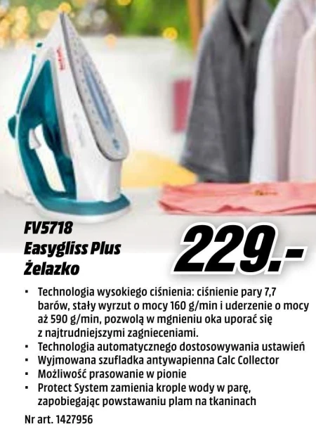 FV5718 Easygliss Plus Żelazko. Technologia wysokiego ciśnienia: ciśnienie pary 7,7 barów, stały wyrzut o mocy 160 g/min i uderzenie o mocy aż 590 g/min, pozwolą w mgnieniu oka uporać się z najtrudniejszymi zagnieceniami. Technologia automatycznego dostosowywania ustawień Wyjmowana szufladka antywapienna Calc Collector • Możliwość prasowanie w pionie . Protect System zamienia krople wody w parę. zapobiegając powstawaniu plam na tkaninach