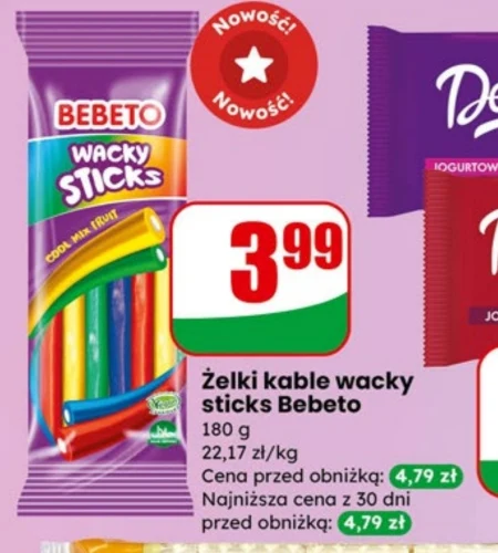 Żelki kable wacky sticks Bebeto 180 g 22,17 zł/kg Cena przed obniżką: 4,79 zł Najniższa cena z 30 dni przed obniżką: 4,79 zł