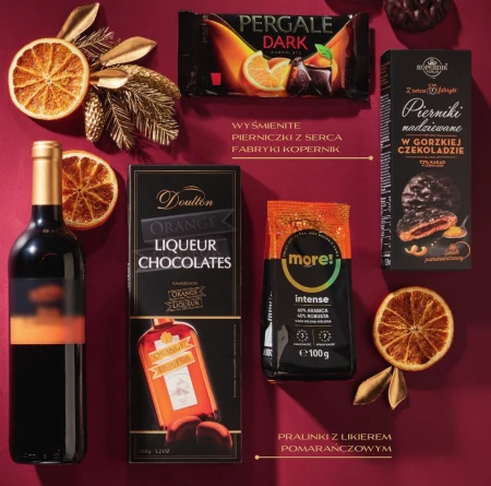BLACK Upominek z klasą SKŁAD PACZKI: wino hiszpańskie Don Labriego, czerwone wytrawne, 0,75 1 Wyśmienite do dań mięsnych i wędlin. • kawa mielona Astra More! Intense, 100 g • pralinki z likierem pomarańczowym Doulton, 150 g pierniki w gorzkiej czekoladzie z nadzieniem o smaku pomarańczowym Kopernik, 150 g • czekolada gorzka z nadzieniem o smaku pomarańczowym Pergalė, 100 g opakowanie: celofan, rafia