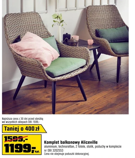 Komplet balkonowy Aliceville aluminium, technorattan, 2 fotele, stolik, poduchy w komplecie nr OBI 3202553 Cena nie obejmuje poduszki dekoracyjnej.