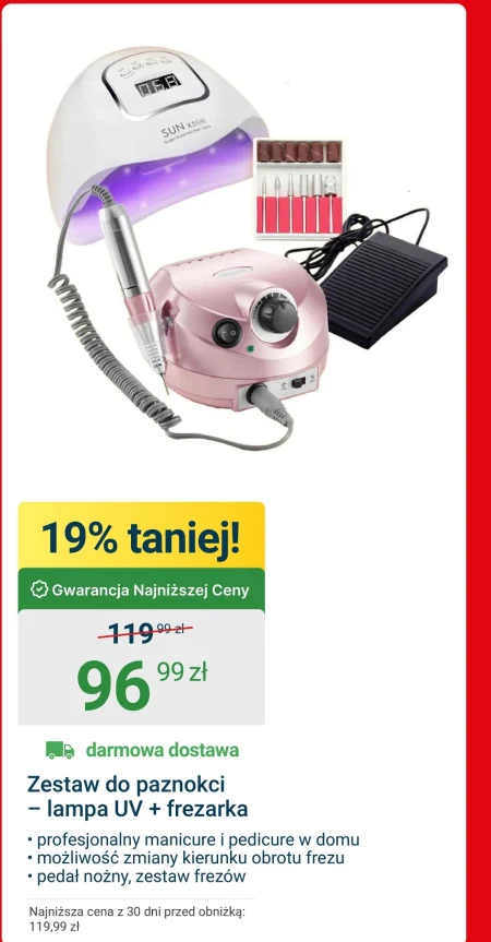 Zestaw do paznokci - lampa UV + frezarka · profesjonalny manicure i pedicure w domu · możliwość zmiany kierunku obrotu frezu · pedał nożny, zestaw frezów Najniższa cena z 30 dni przed obniżką: 119,99 zł