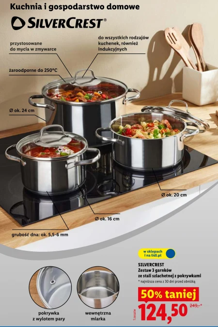 Zestaw trzech garnków ze stali szlachetnej marki SILVERCREST® dostępny jest w ofercie Lidl w cenie 124,50 zł zamiast 249 zł, co stanowi 50% obniżki. Garnki z pokrywkami sprawdzą się w każdej kuchni, dzięki możliwości stosowania na wszystkich rodzajach kuchenek, w tym indukcyjnych, oraz odporności na temperaturę do 250°C. Wyposażone są w wygodną miarkę wewnątrz oraz pokrywkę z otworem do odprowadzania pary, a grube dno zapewnia równomierne rozprowadzanie ciepła. Zestaw obejmuje garnki o średnicach około 16 cm, 20 cm i 24 cm i można je myć w zmywarce. Skorzystaj z okazji i wyposaż swoją kuchnię w wysokiej jakości naczynia w wyjątkowej cenie. Oferta ważna od 2026-04-13 do 2026-04-18 Źródło: gazetka Lidl