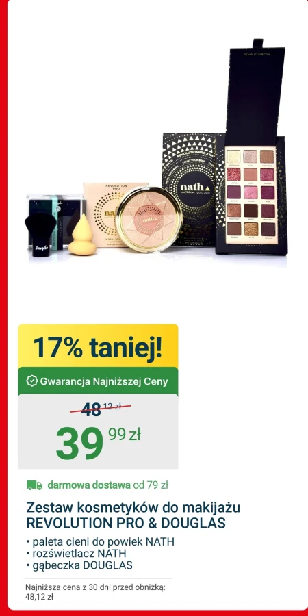 Zestaw kosmetyków do makijażu REVOLUTION PRO & DOUGLAS · paleta cieni do powiek NATH · rozświetlacz NATH · gąbeczka DOUGLAS Najniższa cena z 30 dni przed obniżką: 48,12 zł