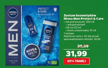 Zestaw kosmetyków Nivea Men Protect & Care > żel pod prysznic 250 ml + antyperspirant roll-on 50 ml + krem uniwersalny 75 ml 1 zestaw Najniższa cena z 30 dni przed wprowadzeniem obniżki: 39,99