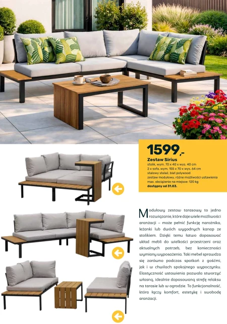 Zestaw Sirius stolik, wym. 70 x 40 x wys. 40 cm 2 x sofa. wym. 155 x 70 x wys. 64 cm stalowy stelaż. blat polywood zestaw modułowy. różne możliwości ustawienia max. obciążenie na miejsce: 120 kg dostępny od 31.03. Modułowy zestaw tarasowy to jedno rozwiązanie, które daje wiele możliwości aranżacji – może pełnić funkcję narożnika, lezanki lub dwóch wygodnych kanap ze stolikiem. Dzięki temu łatwo dopasować układ mebli do wielkości przestrzeni oraz aktualnych potrzeb, bez konieczności wymiany wyposażenia. Taki mebel sprawdza się zarówno podczas spotkań z gośćmi, jak i w chwilach spokojnego wypoczynku. Elastyczność ustawienia pozwala stworzyć własną, idealnie dopasowaną strefę relaksu na tarasie lub w ogrodzie. To funkcjonalność, która łączy komfort, estetykę i swobodę aranżacji.