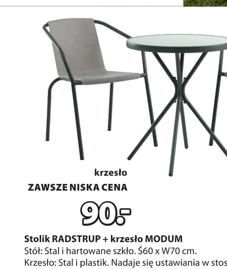 Stolik RADSTRUP w połączeniu z krzesłem MODUM kupisz w ofercie Jysk. Zestaw ten stanowi praktyczne rozwiązanie do niewielkich przestrzeni, idealne do kuchni czy jadalni. Stolik o stalowej konstrukcji posiada hartowane szklane blaty, a krzesło wykonane ze stali i tworzywa sztucznego charakteryzuje się możliwością ustawiania w stos, co ułatwia przechowywanie. To propozycja dla osób ceniących funkcjonalność i prostotę aranżacji wnętrz. Warto rozważyć zakup, jeśli szukasz wygodnego i oszczędnego miejsca do spożywania posiłków. Oferta ważna od 2026-04-22 do 2026-05-10 Źródło: gazetka Jysk
