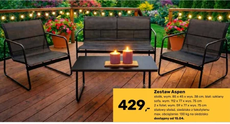Zestaw Aspen stolik, wym. 85 x 45 x wys. 38 cm, blat: szklany sofa, wym. 112 x 77 x wys. 75 cm 2 x fotel, wym. 59 x 77 x wys. 75 cm stalowy stelaż, siedzisko z tekstylenu max. obciążenie: 130 kg na siedzisko dostępny od 15.04.