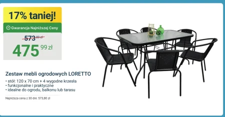 Zestaw mebli ogrodowych LORETTO • stół: 120 x 70 cm + 4 wygodne krzesła • funkcjonalne i praktyczne • idealne do ogrodu, balkonu lub tarasu Najniższa cena z 30 dni: 573,80 zł
