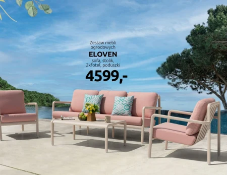 Zestaw mebli ogrodowych ELOVEN jest dostępny w Black Red White w cenie 4599,-. W skład kompletu wchodzą sofa, stolik, dwa fotele oraz poduszki, tworząc idealną przestrzeń do relaksu na świeżym powietrzu. Ten zestaw pozwoli stworzyć przytulną strefę wypoczynkową w ogrodzie, na balkonie lub tarasie, idealną do spotkań z rodziną i przyjaciółmi. To wyjątkowa okazja, by komfortowo urządzić przestrzeń zewnętrzną i cieszyć się pięknem otaczającej natury.