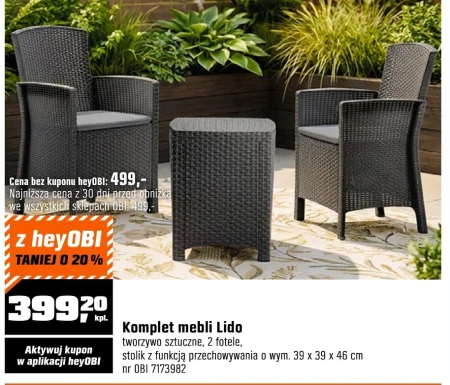 Komplet mebli Lido dostępny w OBI kosztuje teraz 399,20 zł. Zestaw składa się z dwóch foteli oraz stolika z funkcją przechowywania o wymiarach 39 x 39 x 46 cm, wykonanych z tworzywa sztucznego. Ten praktyczny komplet idealnie sprawdzi się na balkonie, tarasie lub w ogrodzie, zapewniając wygodne miejsce do wypoczynku. Skorzystaj z 20% zniżki aktywując kupon w aplikacji heyOBI i urządź swój kącik relaksu w atrakcyjnej cenie.