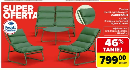 Zestaw mebli ogrodowych Olivka dostępny jest w Carrefour w cenie 799,00 zł, co stanowi obniżkę o 46% z poprzedniej najniższej ceny wynoszącej 1499,00 zł. W skład zestawu wchodzą dwa krzesła, sofa oraz stolik, idealne do relaksu na świeżym powietrzu. Meble ogrodowe zapewnią komfortowe miejsce do wypoczynku w ogrodzie, na balkonie czy tarasie, umożliwiając spędzanie czasu z rodziną i przyjaciółmi. Skorzystaj z wyjątkowej okazji i wyposaż swój ogród w funkcjonalny oraz estetyczny zestaw mebli na nadchodzące ciepłe dni, rozłożony na 10 rat 0%. Oferta ważna od 2026-04-07 do 2026-05-02 Źródło: gazetka Carrefour
