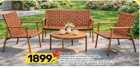 Zestaw Vero jest dostępny w ofercie Bricomarche w cenie 1899,-. Ten komplet mebli ogrodowych, składający się z fotela, sofy i stolika, idealnie sprawdzi się na balkonie, tarasie lub w ogrodzie, zapewniając komfortowy wypoczynek na świeżym powietrzu. Stelaż wykonany z aluminium, pokryty technorattanem imitującym skórę i ramą pomalowaną z efektem drewna, gwarantuje trwałość i estetyczny wygląd. Siedziska wytrzymują obciążenie do 110 kg, a całość stworzy przyjemną strefę relaksu na ciepłe dni. Oferta ważna od 2026-04-08 do 2026-04-18 Źródło: gazetka Bricomarche