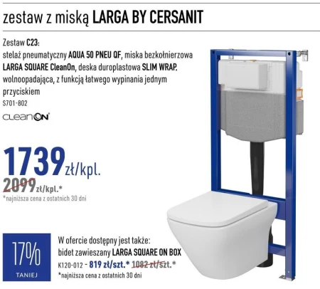 zestaw z miską LARGA BY CERSANIT Zestaw C23: stelaż pneumatyczny AQUA 50 PNEU QF, miska bezkołnierzowa LARGA SQUARE CleanOn, deska duroplastowa SLIM WRAP, wolnoopadająca, z funkcją łatwego wypinania jednym przyciskiem S701-802