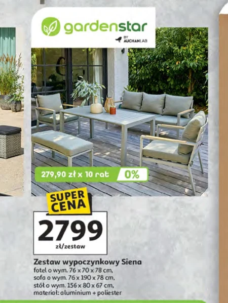 Zestaw wypoczynkowy Siena fotel o wym. 76 x 70 x 78 cm, sofa o wym. 76 x 190 x 78 cm, stół o wym. 156 x 80 x 67 cm, materiał: aluminium + poliester