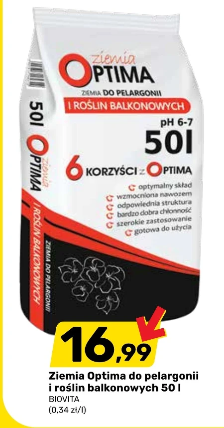 Ziemia Optima do pelargonii i roślin balkonowych BIOVITA o pojemności 50 litrów dostępna jest w Bricomarche w cenie 16,99 zł, co daje tylko 0,34 zł za litr. Ten gotowy podłoża sprawdzi się idealnie do przesadzania i uprawy pelargonii, begonii oraz innych roślin balkonowych, zapewniając im odpowiednie warunki do bujnego kwitnienia. W Bricomarche możesz teraz zaoszczędzić, wybierając tę ekonomiczną, 50-litrową paczkę ziemi.
