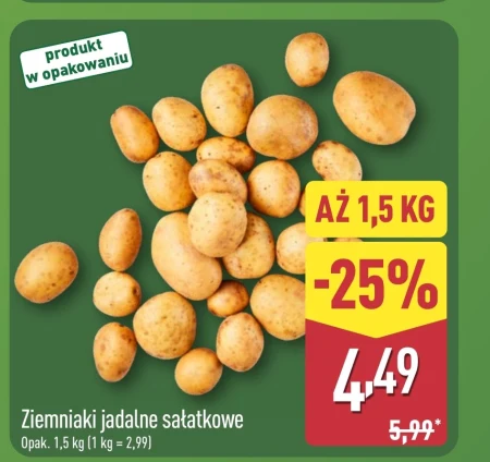 Ziemniaki jadalne sałatkowe Opak. 1,5 kg (1 kg = 2,99) Idealne ziemniaki sałatkowe doskonale sprawdzą się w przygotowaniu lekkich, wiosennych sałatek, a także jako dodatek do mięs i ryb, stanowiąc bazę pożywnego posiłku. Uniwersalne w kuchni, nadają się również do gotowania, smażenia i pieczenia, oferując zdrowy i sycący składnik wielu dań, bogaty w skrobię i witaminy. Wybierając ziemniaki sałatkowe, decydujesz się na wszechstronny produkt spożywczy, idealny do codziennego gotowania i przygotowywania pysznych, domowych potraw.
