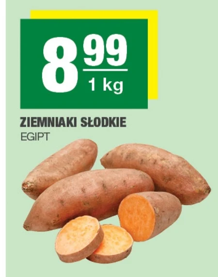 ZIEMNIAKI SŁODKIE EGYPT 8,99 1 kg Słodkie ziemniaki z Egiptu to doskonały składnik do wielu dań – od pieczonych przekąsek, przez gęste zupy, aż po oryginalne desery. W EUROSPAR znajdziesz te wyjątkowe warzywa, które dzięki swojej słodyczy i delikatnej konsystencji dodadzą smaku Twoim potrawom. Możesz je wykorzystać do przygotowania zdrowych i pożywnych posiłków dla całej rodziny. Ich intensywny kolor sprawi, że dania będą również atrakcyjne wizualnie.
