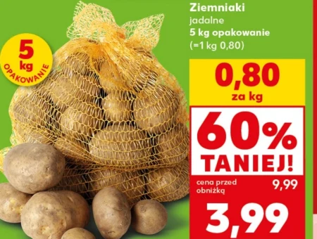 Ziemniaki jadalne dostępne są w Kaufland w cenie 3,99 za 5 kg opakowanie, co daje 0,80 za kilogram, obniżone o 60% z poprzedniej ceny 9,99. To podstawowy składnik wielu potraw, idealny do gotowania, pieczenia, smażenia czy przygotowywania puree. Ziemniaki są uniwersalnym warzywem, które sprawdzi się zarówno w codziennych posiłkach, jak i podczas specjalnych okazji, stanowiąc smaczny i wartościowy dodatek do obiadu. Warto skorzystać z tej okazji i zaopatrzyć się w ziemniaki w atrakcyjnej cenie. Oferta ważna od 2026-04-09 do 2026-04-22 Źródło: gazetka Kaufland