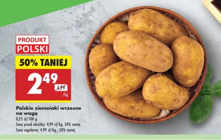 Polskie ziemniaki wczesne na wagę 0,25 zł/100 g Cena przed obniżką: 4,99 zł/kg, 50% mniej Cena regularna: 4,99 zł/kg , 50% taniej