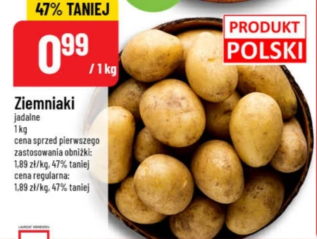 Ziemniaki jadalne 1 kg cena sprzed pierwszego zastosowania obniżki: 1,89 zł/kg, 47% taniej cena regularna: 1,89 zł/kg, 47% taniej