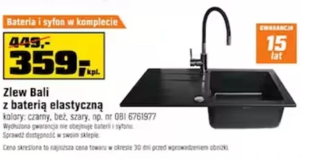 Zlew Bali z baterią elastyczną kolory: czarny, beż, szary. Cena skreślona to najniższa cena towaru w okresie 30 dni przed wprowadzeniem obniżki.