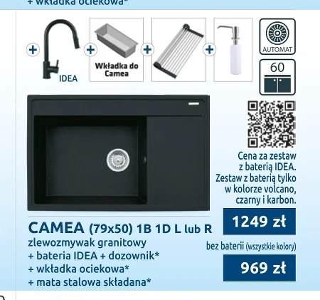 CAMEA (79x50) 1B 1D L lub R zlewozmywak granitowy + bateria IDEA + dozownik* + wkładka ociekowa* + mata stalowa składana* Cena za zestaw z baterią IDEA. Zestaw z baterią tylko w kolorze volcano, czarny i karbon. 1249 zł bez baterii (wszystkie kolory) 969 zł
