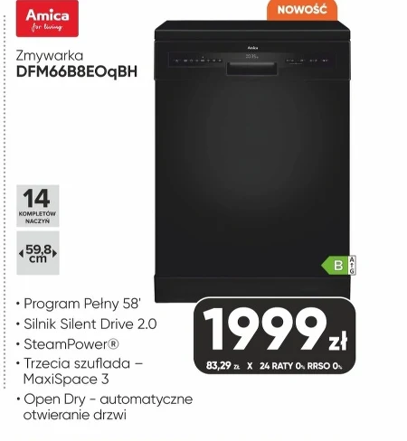 Zmywarka DFM66B8EOqBH jest dostępna w Max Elektro w cenie 1999 zł, można ją również nabyć w 24 ratach po 83,29 zł bez RRSO. Urządzenie pomieści 14 kompletów naczyń, a jej głębokość wynosi 59,8 cm. Zmywarka posiada program Pełny trwający 58 minut, cichy silnik Silent Drive 2.0 oraz funkcję SteamPower®, która wykorzystuje parę do skutecznego usuwania zabrudzeń, a także trzecią szufladę MaxiSpace 3 dla zwiększonej przestrzeni. Dodatkowo, funkcja Open Dry automatycznie otwiera drzwi po zakończeniu cyklu, zapewniając lepsze suszenie. To wyjątkowa okazja, by zainwestować w komfort i wygodę w kuchni.