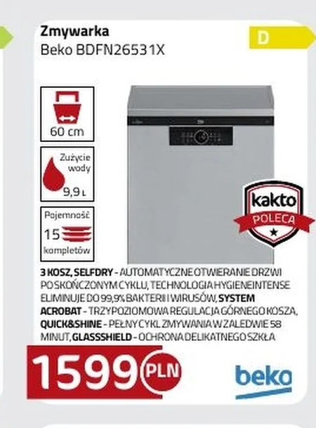 Zmywarka Beko BDFN26531X 3 KOSZ, SELFRY - AUTOMATYCZNE OTWIERANIE DRZWI PO SKOŃCZONYM CYKLU, TECHNOLOGIA HYGIENEINTENSE ELIMINUJE DO 99,9% BAKTERII I WIRUSÓW, SYSTEM ACROBAT - TRZYPOZIOMOWA REGULACJA GÓRNEGO KOSZA, QUICK&SHINE - PEŁNY CYKL ZMYWANIA W ZALEDWIE 58 MINUT, GLASSSHIELD - OCHRONA DELIKATNEGO SZKŁA