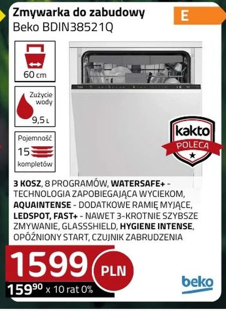 Zmywarka do zabudowy Beko BDIN38521Q 3 KOSZ, 8 PROGRAMÓW, WATERSAFE+ - TECHNOLOGIA ZAPOBIEGAJĄCA WYCIEKOM, AQUAINTENSE - DODATKOWE RAMIĘ MYJĄCE, LEDSPOT, FAST+ - NAWET 3-KROTNIE SZYBSZE ZMYWANIE, GLASSSHIELD, HYGIENE INTENSE, OPÓŹNIONY START, CZUJNIK ZABRUDZENIA