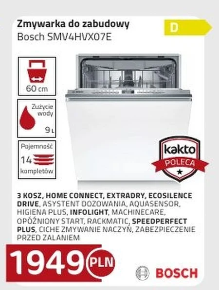 Zmywarka do zabudowy Bosch SMV4HVX07E 3 KOSZ, HOME CONNECT, EXTRADRY, ECOSILENCE DRIVE, ASYSTENT DOZOWANIA, AQUASENSOR, HIGIENA PLUS, INFOLIGHT, MACHINECARE, OPÓŹNIONY START, RACKMATIC, SPEEDPERFECT PLUS, CICHE ZMYWANIE NACZYŃ, ZABEZPIECZENIE PRZED ZALANIEM