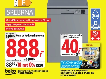 Zmywarka wolnostojąca Beko DVN05320S oferuje pełny cykl zmywania w zaledwie 58 minut, a jej panel sterowania zapewnia wygodną obsługę. Model umożliwia zmywanie nawet przy połowie załadunku, co przekłada się na oszczędność wody i energii. Aktualnie w Media Expert można ją nabyć w atrakcyjnej cenie 888,- zamiast 1499,99, a dodatkowo skorzystać z oferty 10 rat 0% RRSO, co czyni zakup szczególnie korzystnym. Zmywarka sprawdzi się w codziennym zmywaniu naczyń, ułatwiając utrzymanie porządku w kuchni.