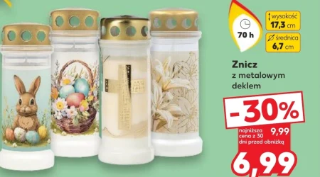 Znicz z metalowym deklem -30% najniższa cena z 30 dni przed obniżką 9,99 6,99 W Kauflandzie znajdziesz znicze z metalowym deklem w obniżonej cenie. Aktualnie kosztują jedynie 6,99 zł, dzięki 30% rabatowi od ceny 9,99 zł, która była najniższa w ciągu ostatnich 30 dni. W ofercie Kauflandu można zaoszczędzić, przygotowując się na nadchodzące dni zaduszne. Warto sprawdzić tę propozycję w najbliższym sklepie sieci.