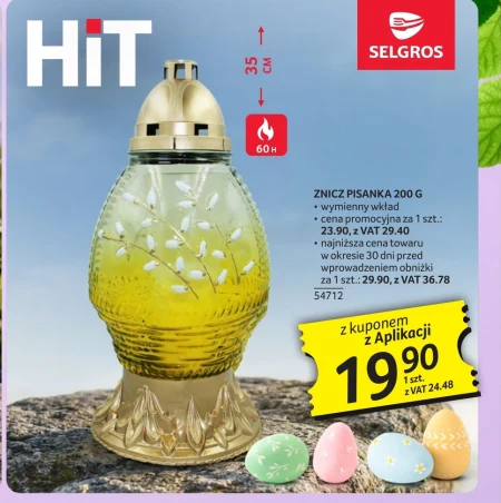 ZNICZ PISANKA 200 G • wymienny wkład • cena promocyjna za 1 szt.: z kuponem z Aplikacji 19,90, z VAT 24,48 • najniższa cena towaru w okresie 30 dni przed wprowadzeniem obniżki za 1 szt.: 29,90, z VAT 36,78 35 CM 60 H Znicz Pisanka o wysokości 35 cm i czasie palenia do 60 godzin dostępny jest w Selgros Cash&Carry w atrakcyjnej cenie promocyjnej 19,90 z kuponem z Aplikacji Selgros. Wymienny wkład znicza ułatwia jego dalsze użytkowanie. Znicz idealnie sprawdzi się jako element dekoracyjny lub pamiątkowy na grobach.