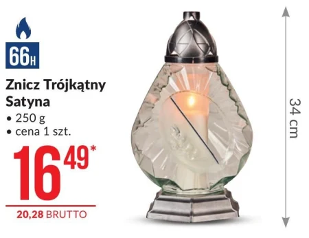 Znicz Trójkątny Satyna, waga 250 g, wysokość 34 cm, czas palenia 66 godzin. Cena netto - 16,49 zł.