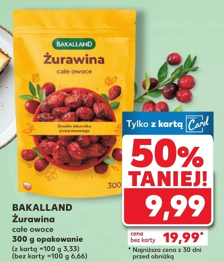 Żurawina Bakalland w Kauflandzie kosztuje 9,99 zł za opakowanie 300 g, co daje 3,33 zł za 100 g przy zakupie z kartą lojalnościową. Bez karty cena za 100 g wynosi 6,66 zł. Promocja obejmuje 50% zniżki dla posiadaczy karty Kaufland Card w porównaniu do ceny bez karty, wynoszącej 19,99 zł. Owoce żurawiny są dobrym źródłem błonnika pokarmowego i idealnie nadają się do przygotowania soków, kompotów, deserów czy jako dodatek do wypieków. Warto skorzystać z tej okazji, ponieważ taka obniżka ceny jest wyjątkowa.