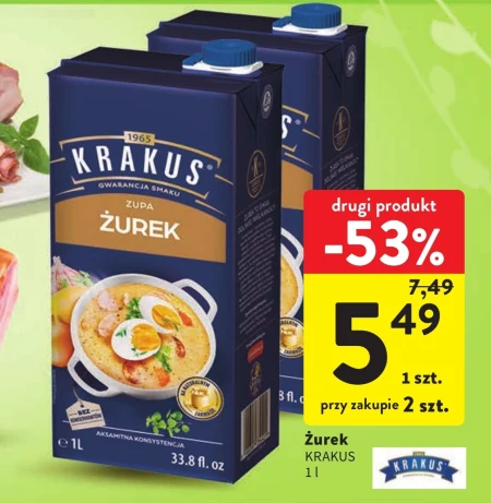 Żurek KRAKUS o pojemności 1 litra występuje w ofercie Intermarche w cenie 5,49 zł, przy zakupie dwóch sztuk obowiązuje promocja z obniżką 53% z ceny 7,49 zł. Ten tradycyjny, kwaśny zupnik to doskonała baza do przygotowania rozgrzewającego posiłku, idealnego na chłodniejsze dni. Żurek świetnie komponuje się z jajkiem, kiełbasą i ziemniakami, stanowiąc sycącą i smaczną propozycję obiadową. Warto skorzystać z tej okazji i zaopatrzyć się w ulubiony smak, zwłaszcza że cena jest teraz wyjątkowo korzystna.