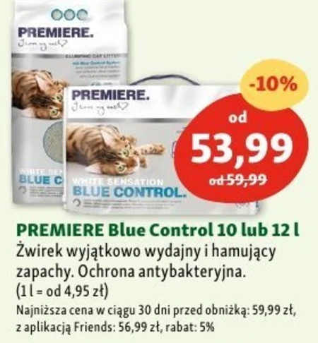PREMIERE Blue Control 10 lub 12 l Żwirek wyjątkowo wydajny i hamujący zapachy. Ochrona antybakteryjna. (11 = od 4,95 zł) Najniższa cena w ciągu 30 dni przed obniżką: 59,99 zł, z aplikacją Friends: 56,99 zł, rabat: 5%
