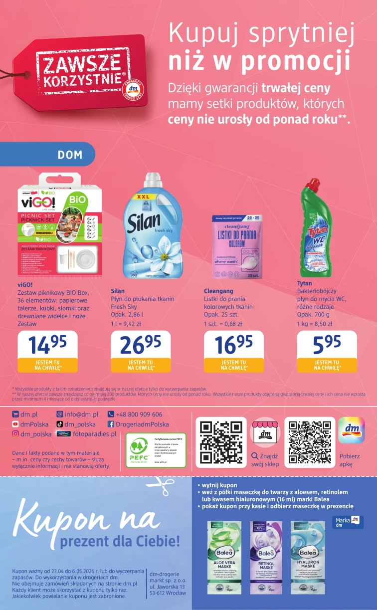 Чи знаєте ви, які акції можна знайти в Drogerie dm? Перегляньте акційну газетку з 2026-04-23 до 2026-05-06. За низькими цінами ви можете придбати: